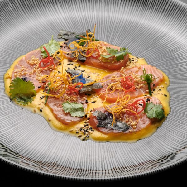 Salmone, salsa al frutto della passione, patata dolce croccante, togarashi